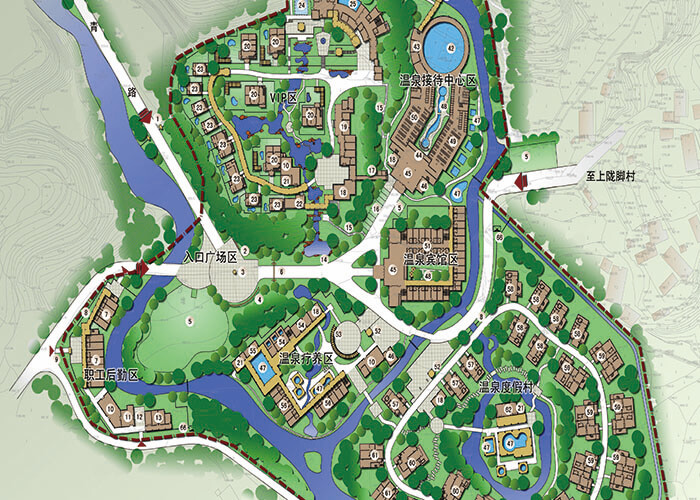 一條景觀主軸是通過大門區圓形廣場連系西端橋梁與東端溫泉賓館,并延伸至上部隴腳村,形成主要景觀游賞大道。二個溫泉旅游片區;即北部公共溫泉接待片區、南部溫泉度假、療養片區。三塊自然臺地為北部鍋底箐峽谷河灘型臺地、南部田園風光臺地、西北部山脊丘陵臺地。八個功能分區分別為入口廣場區、溫泉賓館區、溫泉接待中心區、公共溫泉區、VIP區、溫泉療養區、溫泉度假區、職工后勤區。