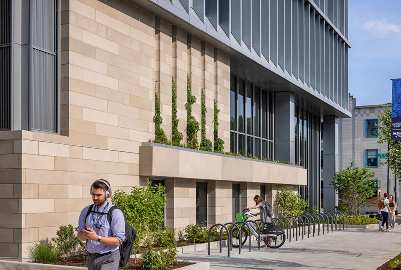 羅伯特-A-M-斯特恩建筑設計事務所(RAMSA)為位于華盛頓市中心喬治敦大學國會大廈校區的麥考特公共政策學院設計了一座新的旗艦建筑。這座新建筑占地 150,000 平方英尺,位于西北部 125 E 街,是學生、教師、研究人員以及活躍在美國首都的廣大決策社區的學術中心。大樓內有大量的教育和社區空間,包括 20 間教室、一個寬敞的主公共空間、學術辦公室、一個可容納 400 人的禮堂,以及一個可俯瞰美國國會大廈全景的大型屋頂露臺和一個可容納 280 人的會場。作為一個致力于應對復雜的國家和國際挑戰的學術中心,麥考特公共政策學院將可持續發展和能源效率放在首位,其設計目標是獲得 LEED 白金級認證。此外,由建筑師、設計師、藝術家和雕塑家瑪雅-林(Maya Lin)設計的一系列針對特定場所的原創裝置,鼓勵建筑使用者考慮周圍的自然環境。作為國會大廈校區的旗艦建筑,麥考特學校是喬治城市中心文脈和連貫性的延伸。125 E St.是一座由石材、鑲板金屬和玻璃幕墻組成的立方體建筑,其外形和規模與周邊建筑一脈相承。垂直鰭片和磚砌底板--主要用于遮擋陽光并優化熱性能--用凸出的線條勾勒出建筑的立面,與鄰近的西北第一街 500 號的統一沖孔窗戶遙相呼應。然而,麥考特學院的 125 E St. 建筑則通過金屬、石材和玻璃的交錯使用,引入了新的視覺趣味。麥考特公共政策學院的內部建筑是由其獨特的地理位置所提供的教育機會所決定的,即靠近美國國會大廈和最高法院等國家主要決策機構。可容納 400 人的禮堂具有廣播功能,屋頂場地可容納 280 人,可接待主要的政策制定者和從業人員,進行與國家和國際政策制定相關的重要討論。大樓的設計提倡有機互動和偶遇,以促進形成一個強大、互聯和包容的學術社區。瑪雅-林工作室(Maya Lin Studio)的一系列裝置作品名為 “映射我們在世界上的位置”(Mapping Our Place in the World),為室內空間增添了活力,使居住者置身其中,促使他們思考自己與更廣闊世界的聯系。“波托馬克河沿岸 "是一個安裝在天花板上的玻璃大理石作品,仿佛鳥瞰波托馬克河流域。在主公共區,一系列名為 “是否有鳥 ”的天氣響應吊燈會根據陽光、云朵、雪或雨的存在而改變顏色。當地水道、濕地、森林和草地在一天和一年中不同時間的錄音,通過主樓梯上方的定向揚聲器播放。林還參與了建筑屋頂景觀的設計。“空中花園 "是一個帶有橢圓形水池和本地植物的室外露臺。它為人們提供了安靜交談和休憩的機會,同時還弘揚了地區生態,并將美國國會大廈的美景盡收眼底。