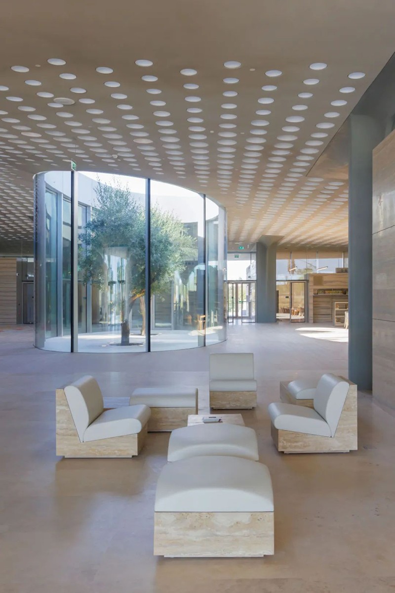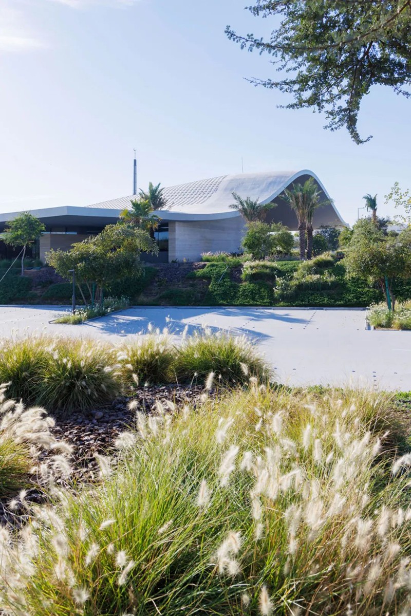 建筑的波浪形屋頂象征女性持續(xù)向上、自我成長的力量。兩棵橄欖樹穿過屋頂結(jié)構(gòu)、向天而立,寓意和平與生命的延續(xù)。室內(nèi)外空間通過庭院與花園過渡連接,強化了人與自然的精神交匯,為來訪者提供安靜冥想與社區(qū)互動的可能。