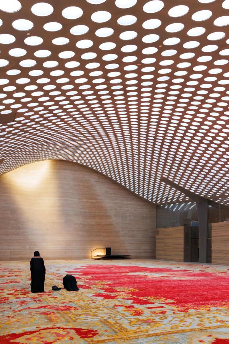 項目的核心為空間是一個面積875平方米的祈禱大廳,略微偏離建筑網(wǎng)格17度,準確朝向麥加。廳內(nèi)鋪設(shè)有由新西蘭羊毛制成的大型手工簇絨地毯,其圖案以集體尺度重釋了傳統(tǒng)伊斯蘭幾何紋樣。天花布置了5,500個錐形天窗,將自然光引入室內(nèi),營造出神圣靜謐的光環(huán)境。