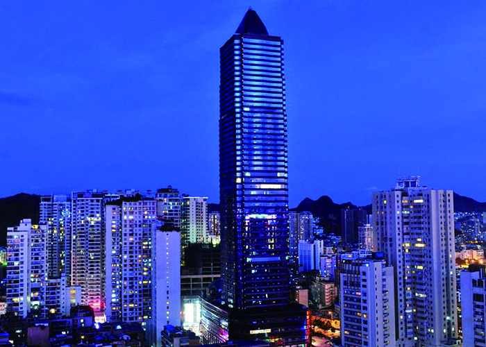 貴陽市凱賓斯基大酒店位于貴陽市護國路與指月街交接處,建設用地5740平方米,由塔樓、裙樓、地下室組成。其中塔樓為53層超高層建筑,總建筑面積約7.8萬平方米,設三層地下室,地下室埋深12.6M,塔樓與裙樓在地下室部分連接,本工程設有六層裙房、三層地下室,使用功能為設備用房、車庫、辦公、商場、餐飲娛樂;7層~26層為寫字間,28層~53層為酒店;14層、27層、40層為避難層;層面標高自地面以上為212.0M,根據貴陽地震設防烈度低、基礎持力層承載力大的特點,采用鋼筋混凝土框筒結構,其中框架柱通過設置芯柱有效減小柱截面。